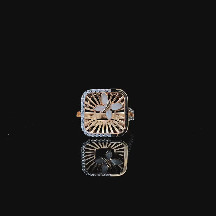 This elegant gold ring showcases a beautifully crafted butterfly motif set within a modern geometric frame, creating a design that feels both graceful and contemporary. Made in fine-quality gold, the ring features a delicate combination of warm gold tones and a subtle diamond-finish border that adds a soft sparkle without overpowering the design. The butterfly symbolizes beauty, transformation, and elegance, making this ring a meaningful addition to any jewellery collection.