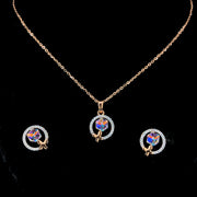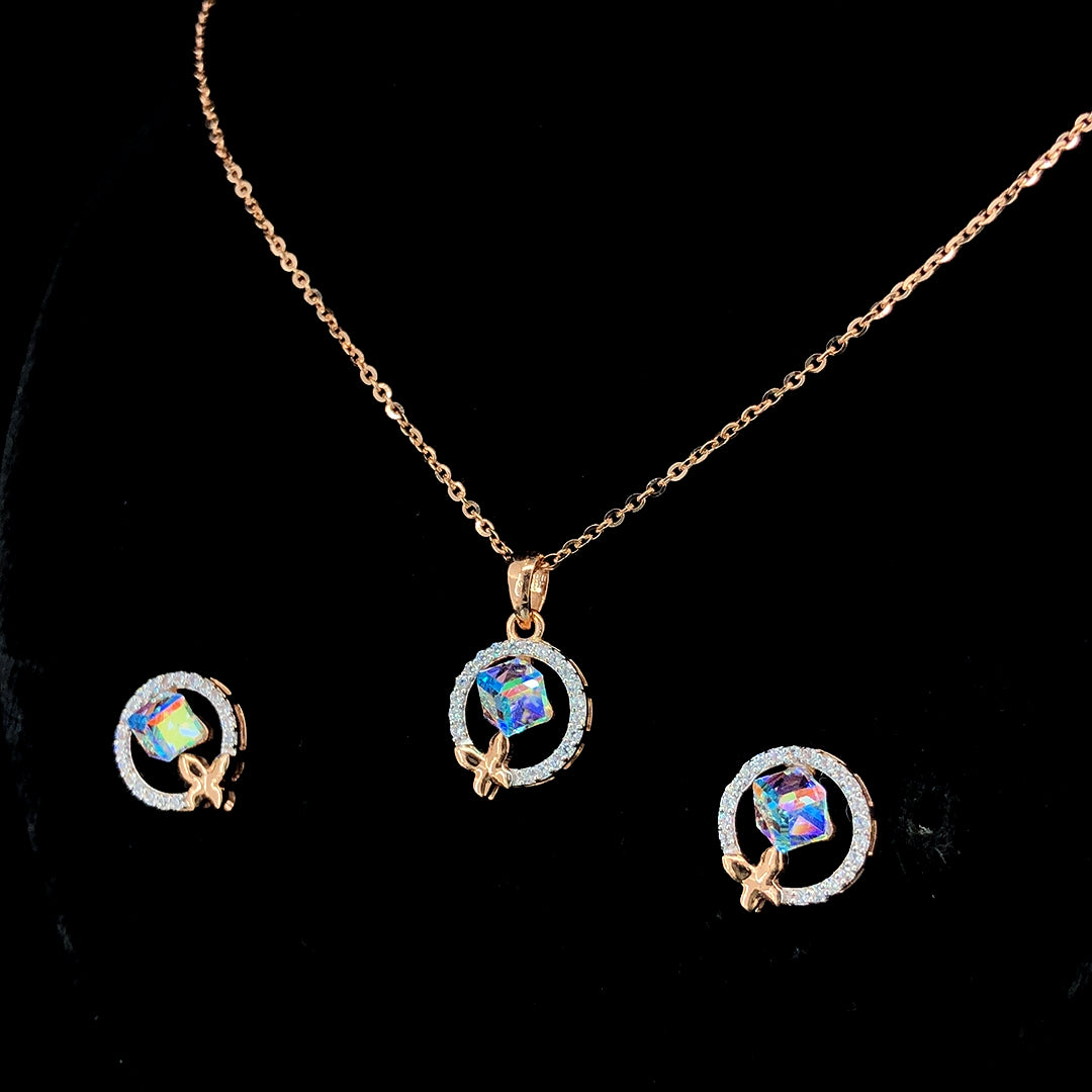 This elegant gold pendant set with matching earrings is designed for women who appreciate refined beauty and modern style. Crafted in high-quality gold, the set features a graceful circular pendant highlighted with a stunning multicolor stone that reflects light beautifully from every angle. The sparkling finish around the stone adds a subtle brilliance, making the design look sophisticated yet delicate.